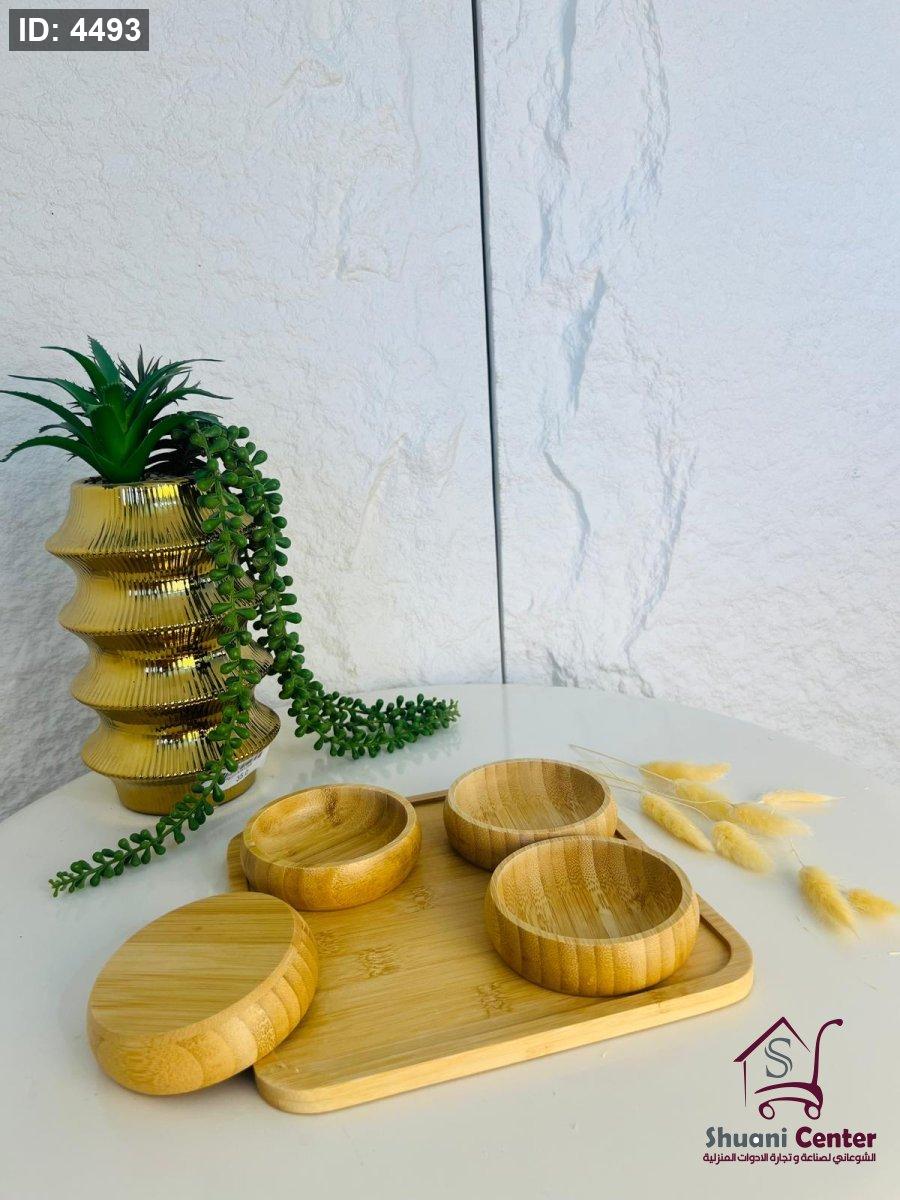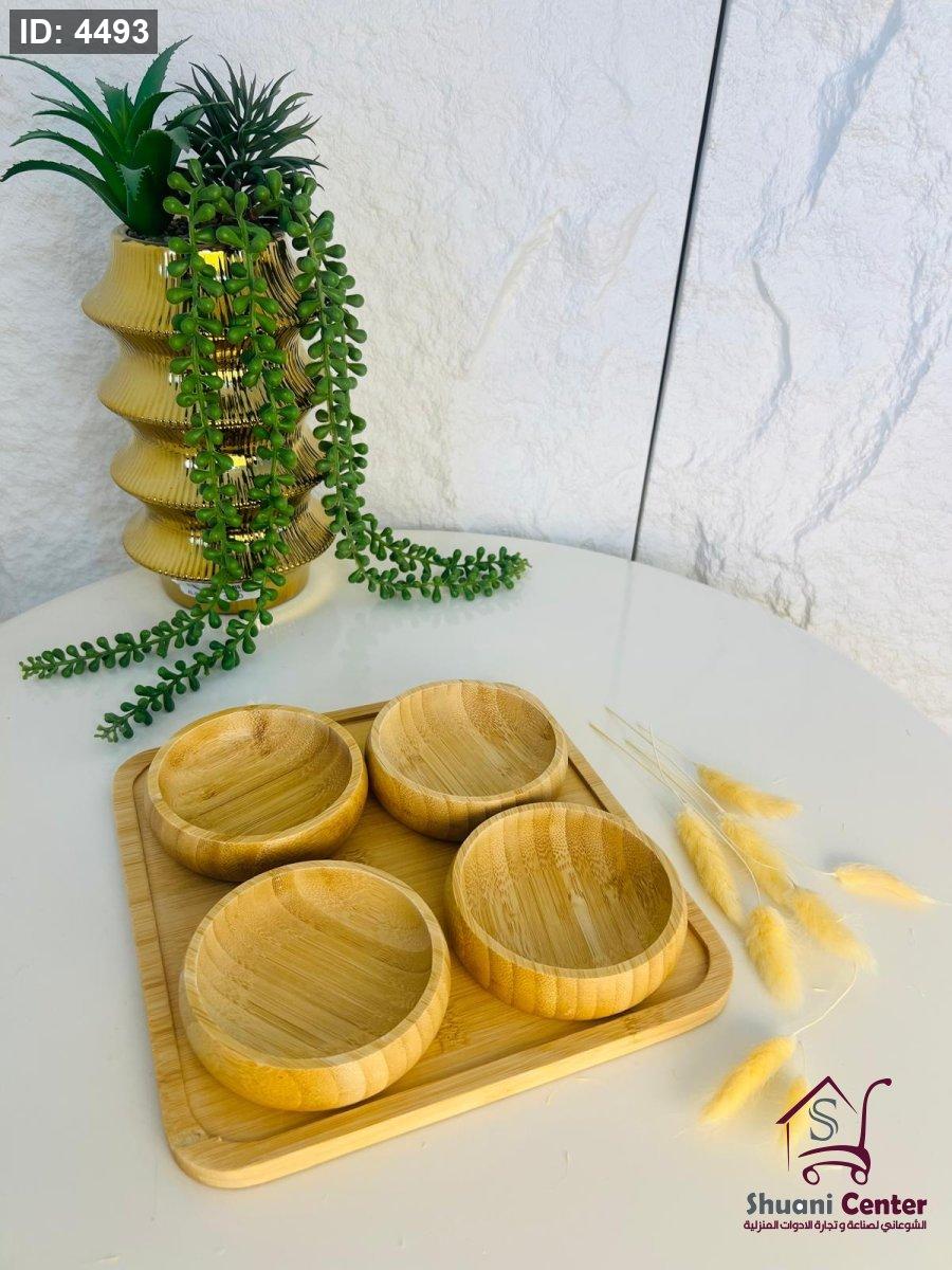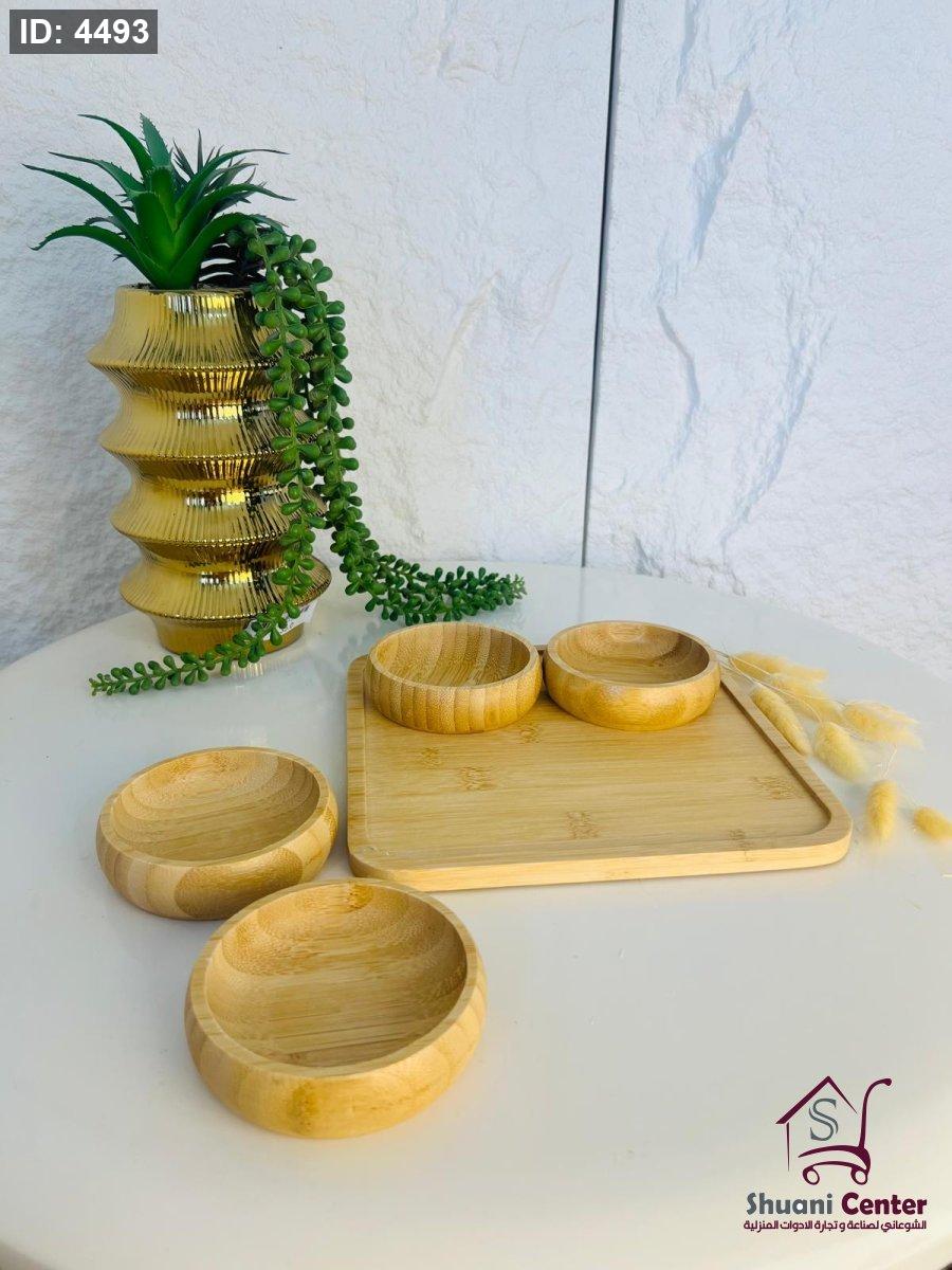 مضيفة خشبية مميزة مكونة من اربع زبادي وصحن تقديم مميز عملية ومتعددة الاستخدام وذات جودة عالية