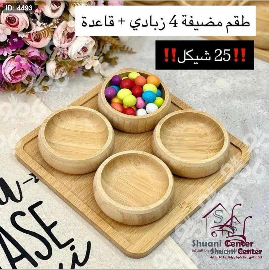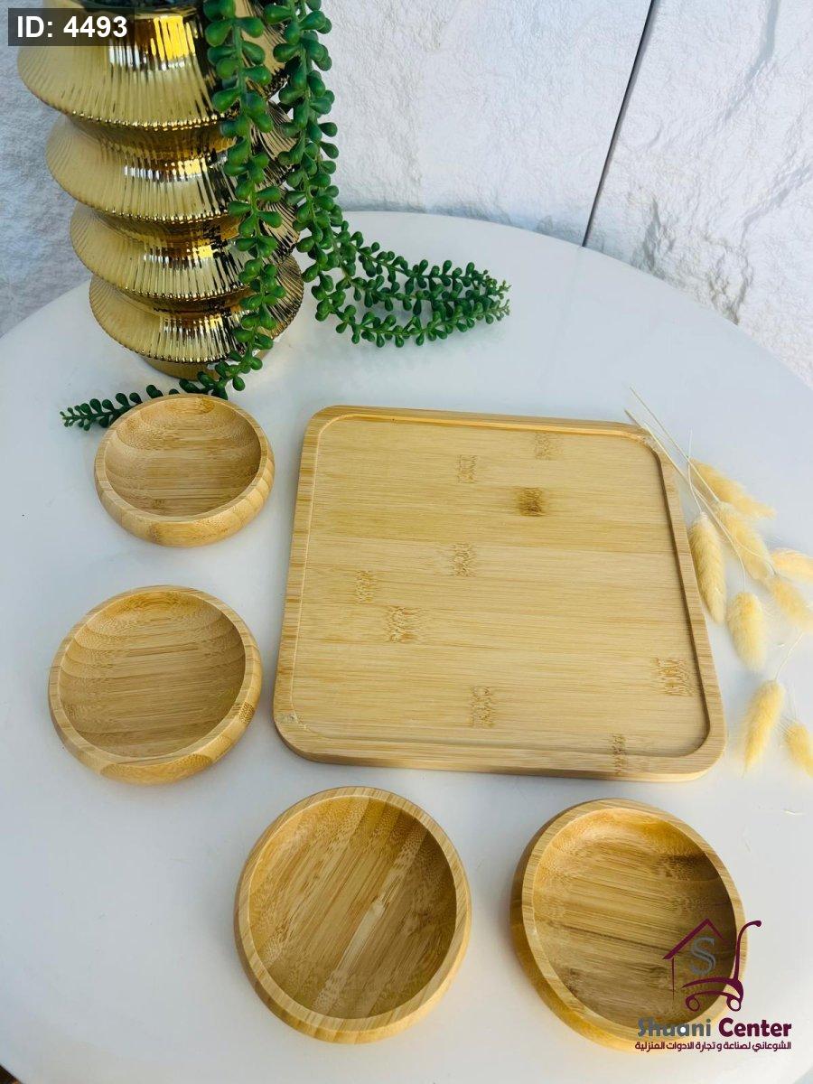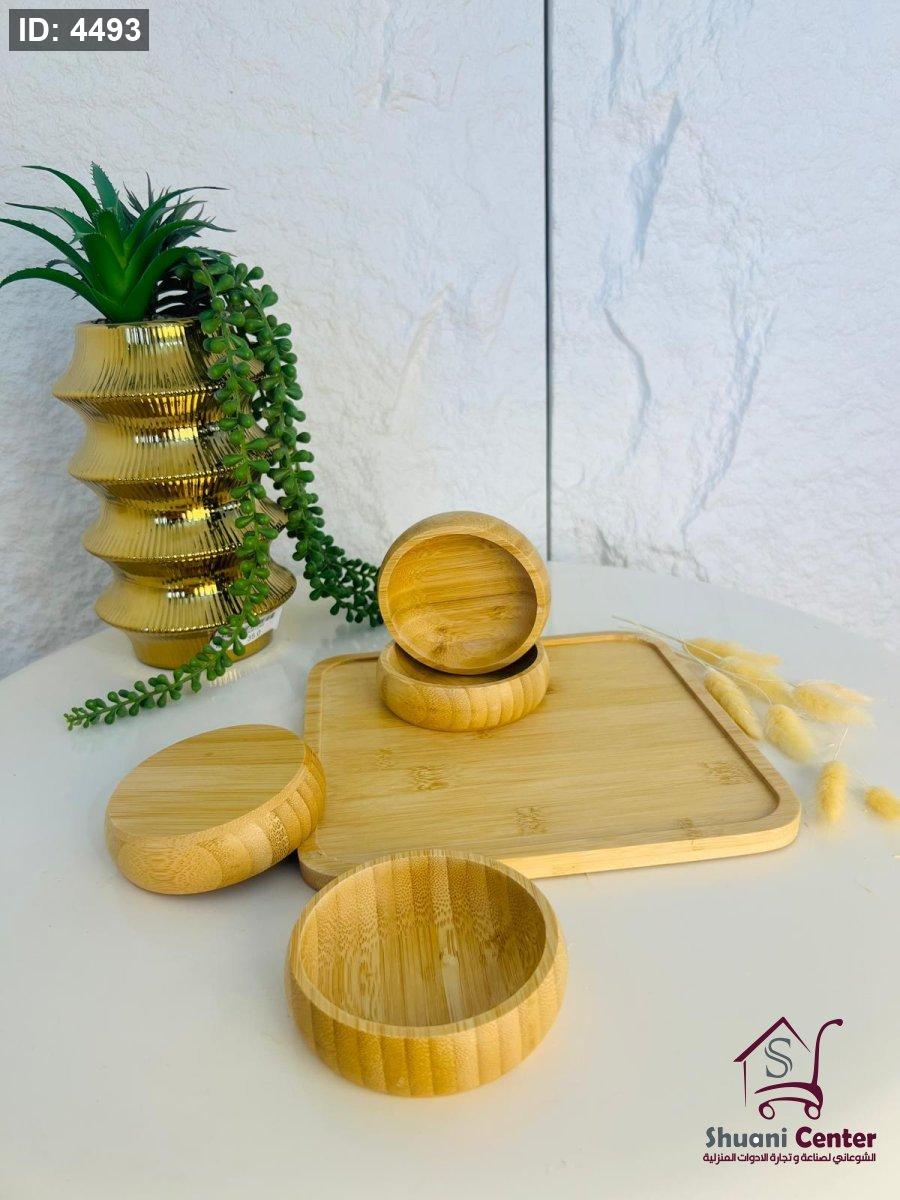 مضيفة خشبية مميزة مكونة من اربع زبادي وصحن تقديم مميز عملية ومتعددة الاستخدام وذات جودة عالية
