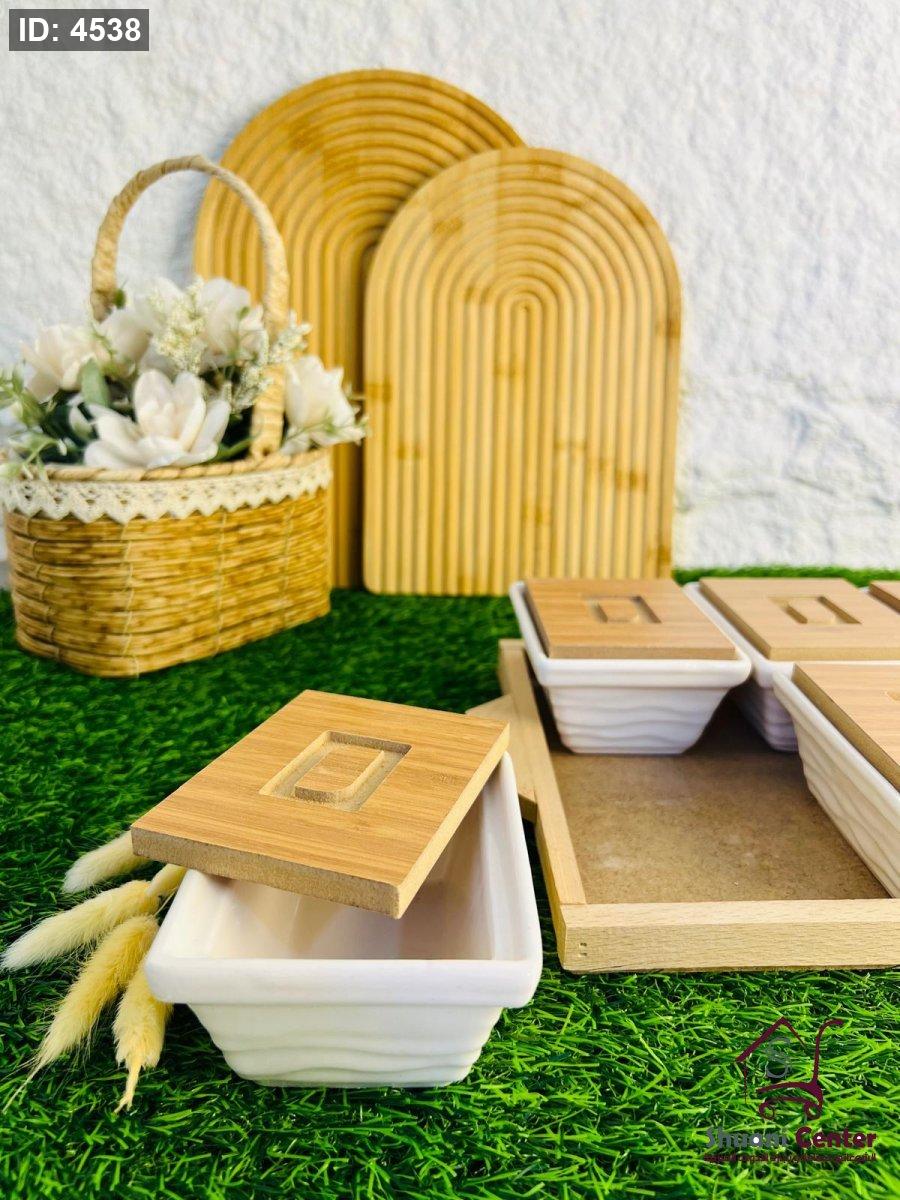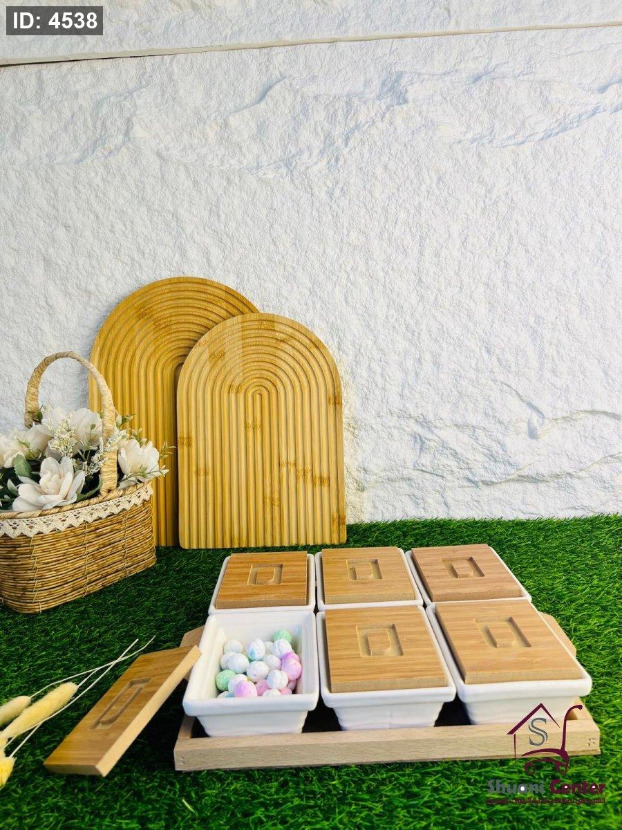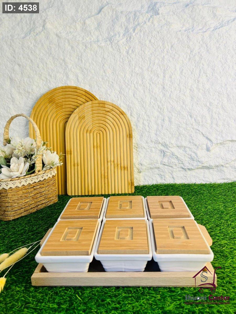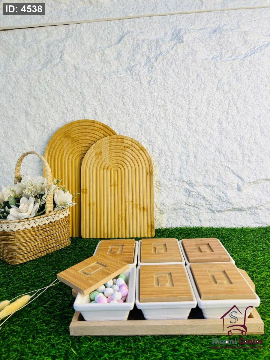 مضيفة مميزة وثقيلة مكونة من 6 زبادي زجاجية باغطية وقاعدة خشبية أنيقة وجذابة