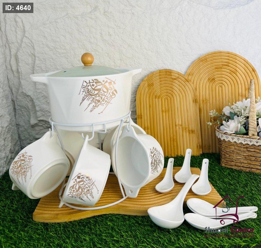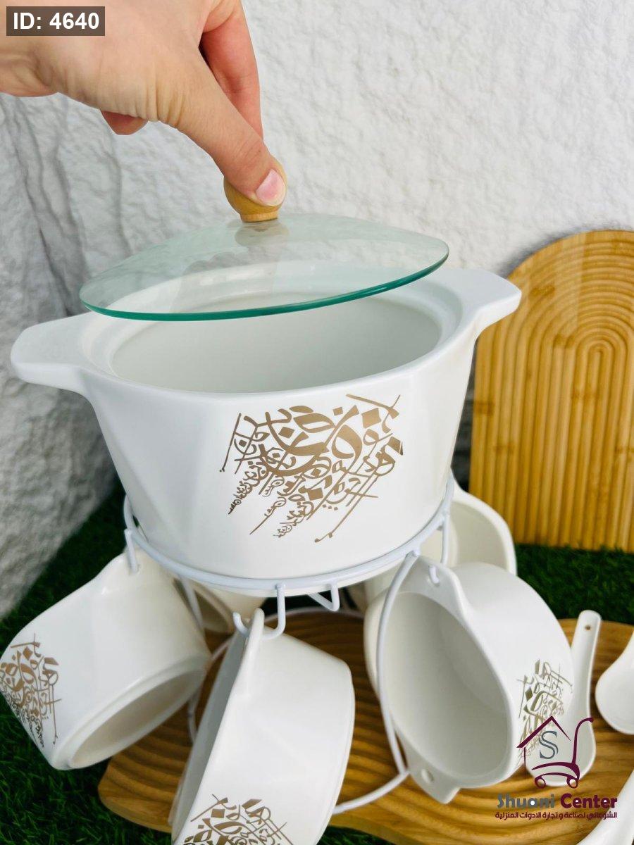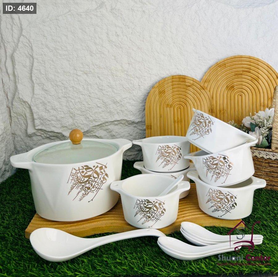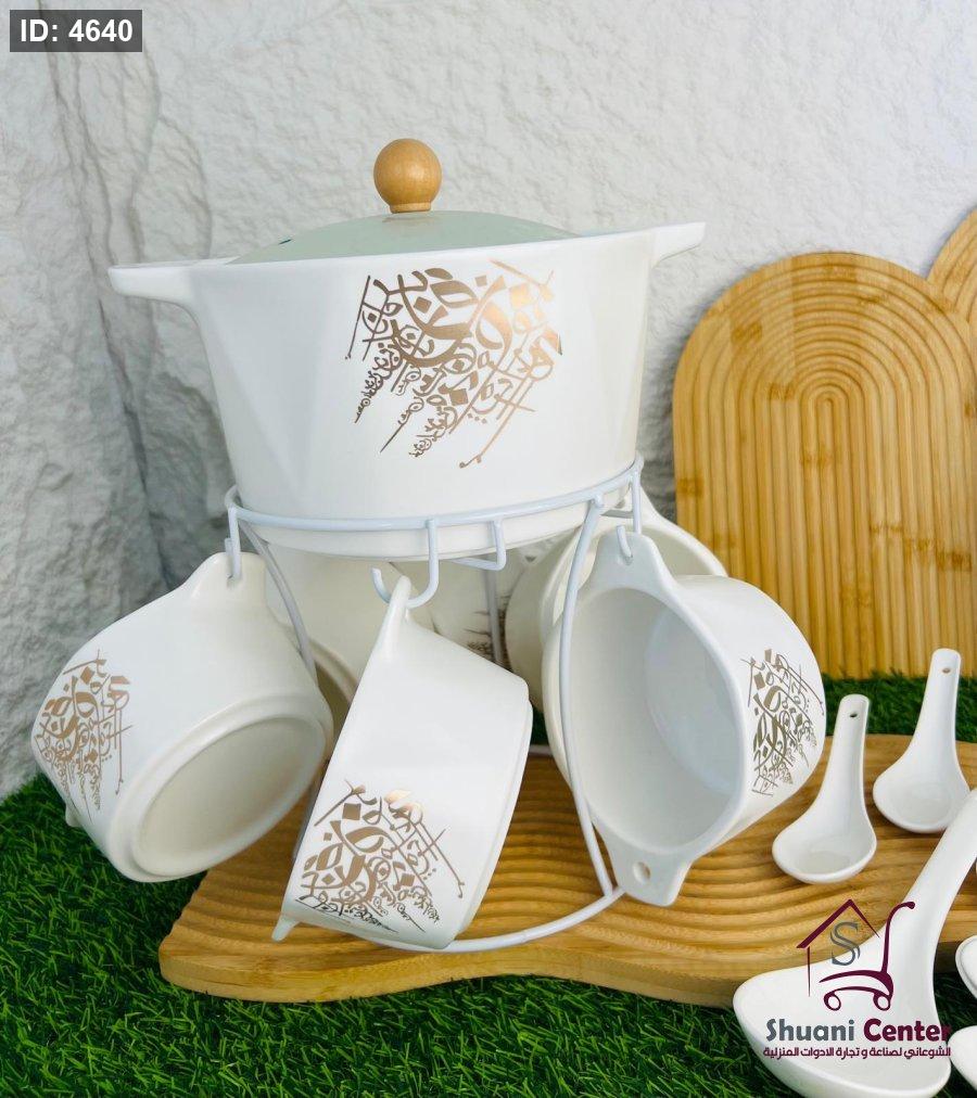 طقم شوربة مميز طنجرة بغطاء مع 6 ملاعق ومغرفةو 6 زبادي أنيق وجذاب جدا وينقل سفرتك للفخامة