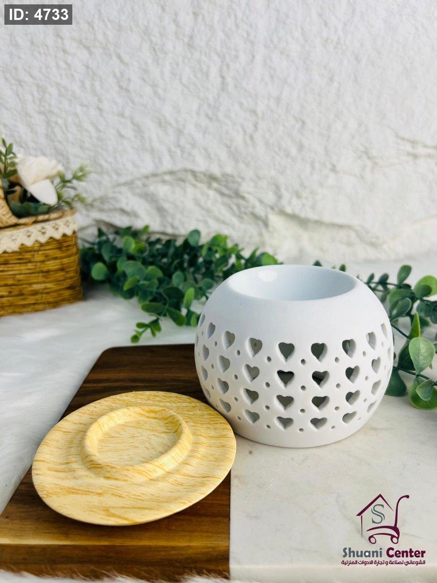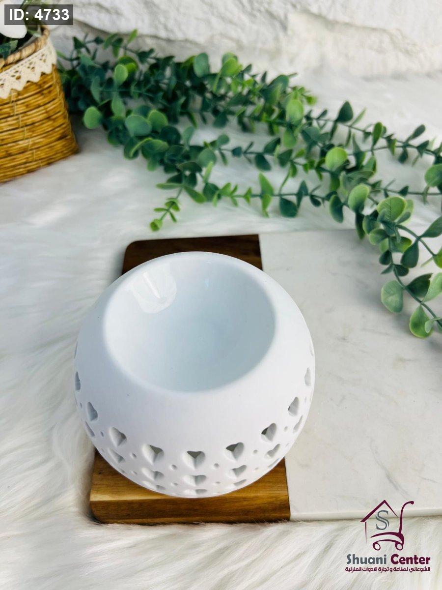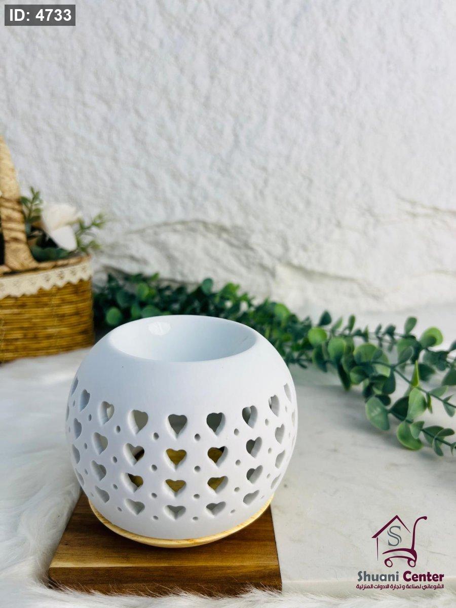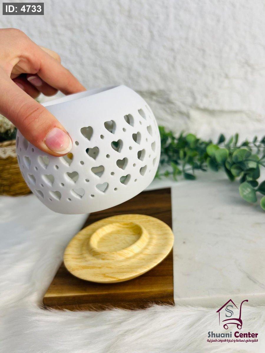 مبخرة زجاجية مخرمة بيضاء اللون بقاعدة لون خشبي انيقة وعصرية لاصحاب الذوق الرفيع