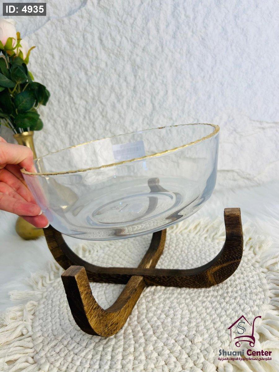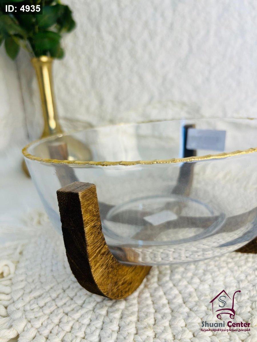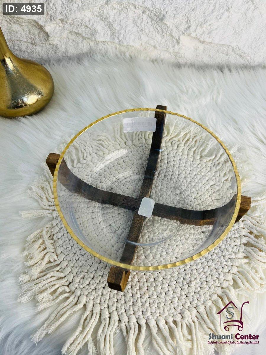 صحن تقديم زجاجي مميز بقاعدة خشبية أنيق وجذاب وفخم لاصحاب الذوق الرفيع