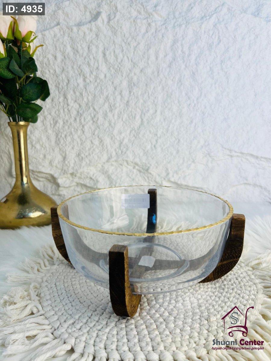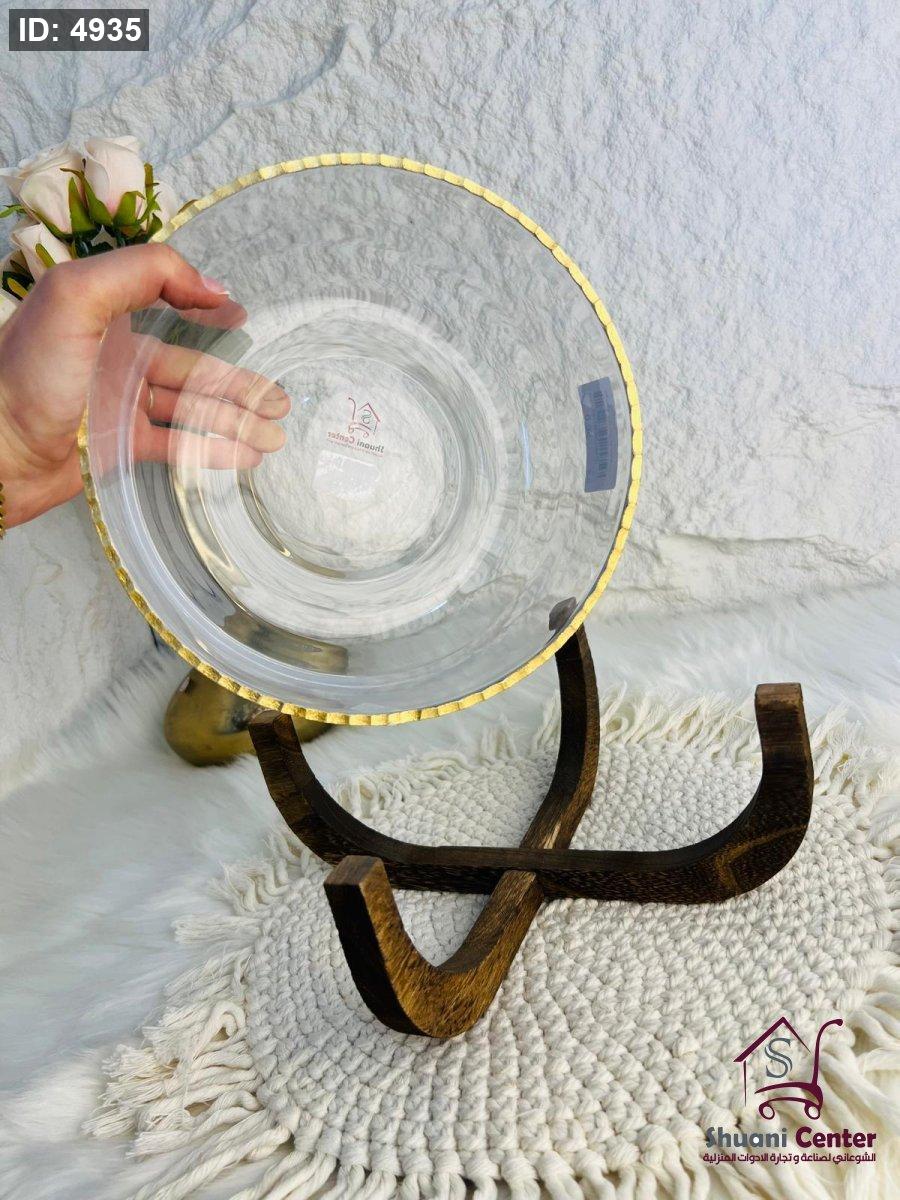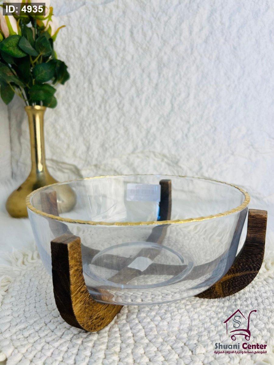 صحن تقديم زجاجي مميز بقاعدة خشبية أنيق وجذاب وفخم لاصحاب الذوق الرفيع