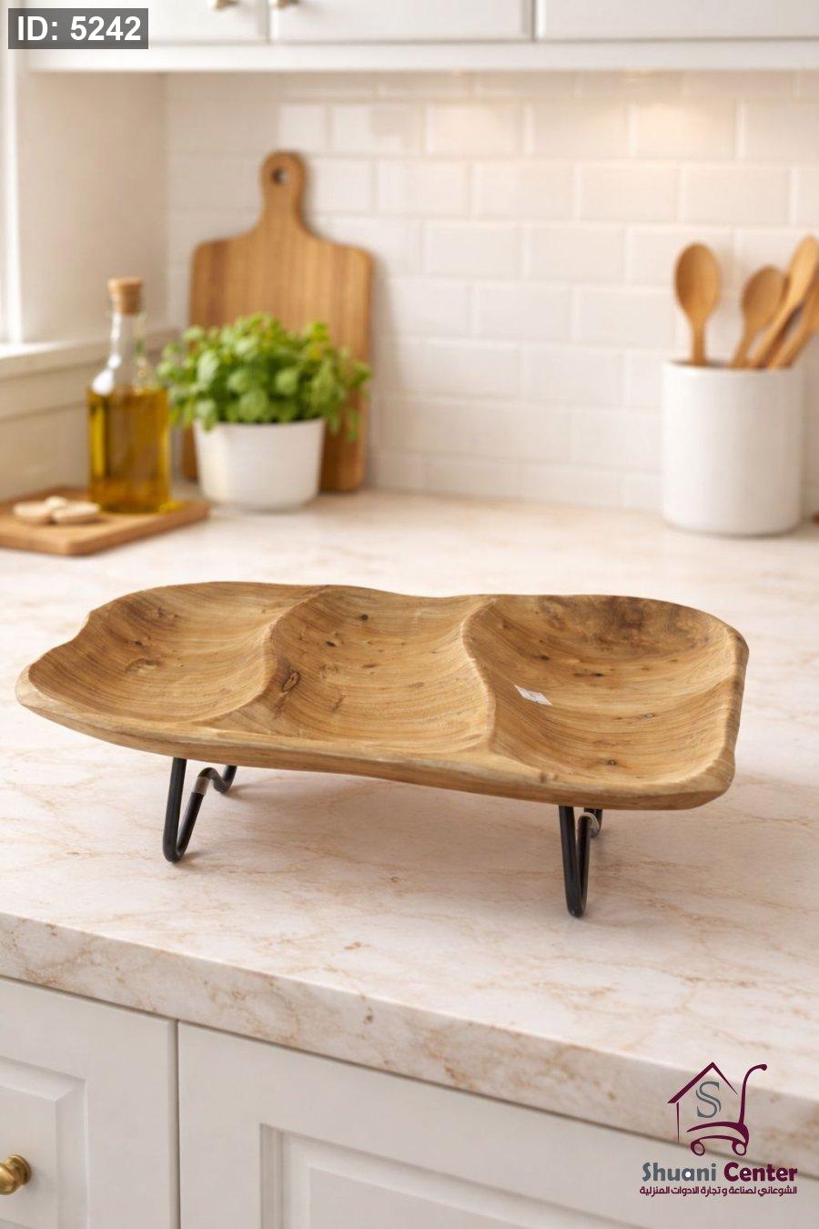 طبق تقديم خشبي طبيعي مقسم بثلاثة اقسام مع حامل معدني مثالي لتقديم المكسرات أو الفواكه